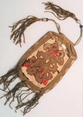 形态特征:皮质方形烟口袋,上端用皮条收紧,皮条的两端装饰料珠,边缘装饰有皮条穗,烟口袋下方有六处皮穗装饰,表面用棕色线条盘出如意云纹,底子为黑皮,部分黑皮下面衬出红布,红布有四处,上方一处,下方三处,都在树叶形下方,部分黑皮干裂后脱落