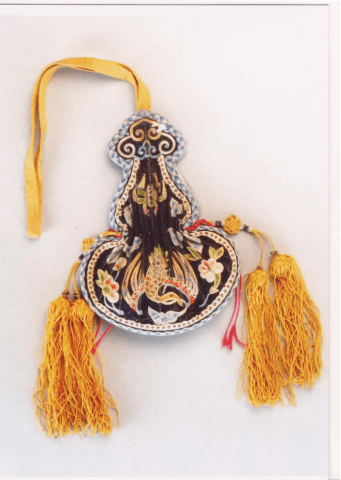 形态特征:凤纹绣花荷包为葫芦形,头为如意云头,黑缎面、两面绣相同图案,上为螃蟹级、下为凤级,凤两为花级,用蓝布为里,用蓝格布作也,如意云头上连黄色挂带,可挂在腰上,还有两个编制成的中国传(盘肠级)下有黄穗。
