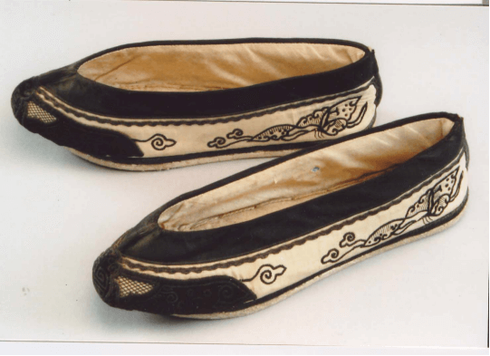形态特征:女鞋为船型,单鞋鞋面为白绸质地,鞋尖补绣团寿纹、云头纹,鞋帮绣蝴蝶纹,白布里,白布底,是达斡尔族女鞋,底比面小块,从这一点可以看出受满族文化的影响。