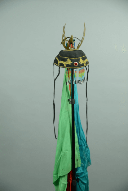 形态特征:犴皮对襟,披肩由贝壳、布谷鸟组成,服装前后由铜镜、铜铃,袖子、服装底部刺绣花草纹图案,身后腰部有二十四条刺绣彩带,帽子刺绣虎纹,两侧有系带,顶部铜制神鹰、鹿角,后面缝合彩带。