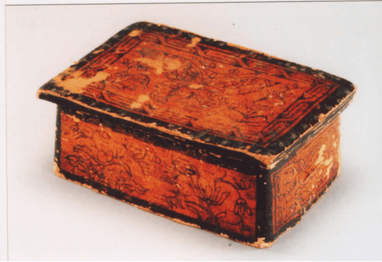 形态特征:长方形,有盖,盖顶墨绘蝴蝶花卉纹,边有一周单回纹,四侧面墨绘图案,较大的两侧面分别墨绘房屋达斡尔族民居和花卉纹,较小的两侧面墨绘如意纹,较小的两侧面叠压缝合的,缝制使用细麻线。
