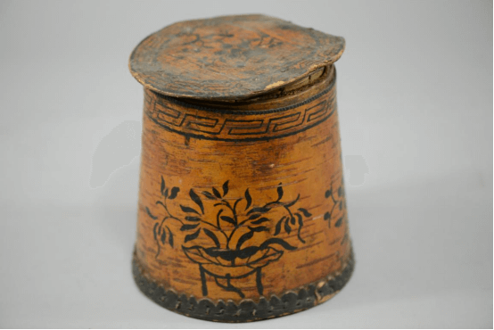 形态特征:圆筒形,盖、筒身墨绘花草纹图案,圆齿形底围。